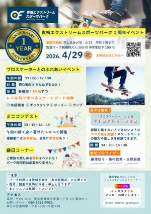 4月29日(水、祝)に青梅エクストリームスポーツパーク 1周年記念イベントを開催します!NEW!